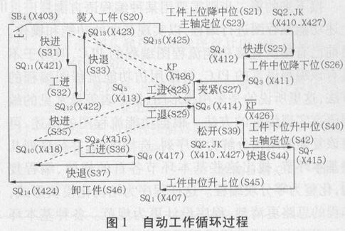 | 0 引言 组合机床是针对某些特定工件,按特定工序进行批量加工的专用设备。随着PLC的广泛应用和机床电控技术的不断发展,利用PLC实现对组合机床的自动控制,无疑是今后的发展方向,而针对这种控制的PLC程序设计也显得尤为重要。这种控制属于顺序逻辑控制,有多种编程方法与语言可供选择,编程中也有一些技巧与规律可循。下面较为详细的介绍一组合机床自动控制的PLC程序设计实例。 1 实例工作过程及程序设计思路 本文给出的实例是一台立卧三面镗床,有右头、左头及上头三个工作头,有自动循环(三头同时加工)和单头调整四种不同工况。三头同时加工时,一个自动工作循环过程如图1所示。其特点是多头同时加工和多工步,体现在控制要求上是:工步之间转换条件较复杂,存在并行同步问题,记忆、连锁等问题也较多。鉴于此,应采用顺序功能流程图的程序设计方法:首先根据对工作过程的分析对各步、转换条件及路径进行全面定义,确定各步的动作,然后按照控制要求,运用指令对各步和转换进行编程。 ![]() |
