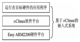 图5 Easy ARM2200开发板 开发板上除了提供键盘、LED和RS232等一些常用功能部件外,还具有4Mb SRAM、16Mb FLASH、IDE硬盘接口、CF存储卡接口、以太网接口和Modem接口等。 本文选择在μClinux操作系统上调试MPEG4解码程序。调试过程分为以下几个步骤: 图6 为一个基于μClinux的嵌入式系统典型框架结构图。