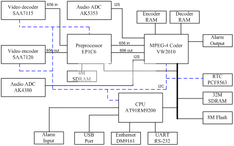 1引言 随着网络带宽、计算机嵌入式CPU/FPGA/DVR/MPEG-4;处理能力和存储容量的快速提高,以及如MPEG-4、H.264等各种视频编码技术的涌现,从而使嵌入式DVR网络监控系统得以迅速发展与普及。 MPEG-4标准采用基于对象的编码理念,支持内容的可分级性,并具有基于内容的交互性、高效的压缩性和通用的访问性等特点。MPEG-4提供了易出错环境的鲁棒性,来保证嵌入式CPU/FPGA/DVR/MPEG-4;其在许多无线和有线网络及存储介质中的应用。因此,在嵌入式多媒体网络监控系统中采用MPEG-4视频压缩技术不仅能够获得其在视频处理方面的诸多优势,而且有利于网络的实时传输及硬盘存储,实现真正意义上的网络远程实时监控。 文章嵌入式CPU/FPGA/DVR/MPEG-4;针对实际需求,提出了采用VW2010编解码芯片为核心的嵌入式MPEG-4 DVR监控系统的设计方案,详尽介绍了系统的设计原理和VW2010芯片的应用。此次设计结合了高效的音视频处理技术、大容量的信息存储技术、网络传输技术以及低功耗高稳定性的嵌入式技术于一身,是当代安防领域的新应用,在高端视频监控领域具有较广阔的应用前景。 2 DVR系统硬件设计原理 2.1 系统组成 由图1系统实现框图所示,系统框图中嵌入式CPU/FPGA/DVR/MPEG-4;蓝色虚线为I2C总线,黑色粗线为地址数据和控制总线。系统硬件核心由:VW2010编解码芯片、AT91RM9200嵌入式CPU[3],以及EP1C6 FPGA处理芯片[4]构成。整个系统共分5大功能模块,分别为:视频前端解码A/D转换模块、视频预处理及后处理FPGA模块、MPEG-4编码和解码模块、主控制芯片AT91RM9200模块、视频后端编码D/A转换模块。 视频前端解码A/D转换模块: 视频前端解码A/D转换模块选用SAA7115(一路实时或两路分时)或者TW2824(四路实时)视频解码芯片来实现视频信号采集,并对采集获得的视频信号进行模数转换。然后向视频预处理及后处理FPGA模块输出ITU-R.BT.656标准的8bitYUV数字视频信号,以及所需的8bit的VBI信号。SAA7115和TW2824可分别由主控制CPU或VW2010芯片通过I2C总线进行控制。当在视频预处理及后处理FPGA模块中进行特殊图像处理时,由主控制CPU采用I2C总线模式进行控制;当无需特殊处理时,可把视频预处理及后处理FPGA模块视为直通数据传输通道,此时可由VW2010芯片自带的ICI总线模式直接对其进行控制。
