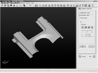 完成网格划分后,需要设置冲压工艺,可以在软件中完成对拉延筋、压边力、压力垫、冲压方向及毛胚等的设置,如图4所示。