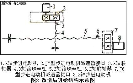 1 机械部分的改造 把C6132普通车床改成数控车床的主要改造部位:主电动机和水泵电动机能分别通过M03、M04、M05、阴刀、M09等指令来进行控制;把原来的手动进给改成微机控制,实现二轴联动;为实现螺纹车削在主轴后端加一光电编码器。 机械部分的改造,在原机床的基础上,去掉挂轮箱(保留三星齿轮)、进给箱、溜板箱、刀架部分,保留大拖板、中拖板。