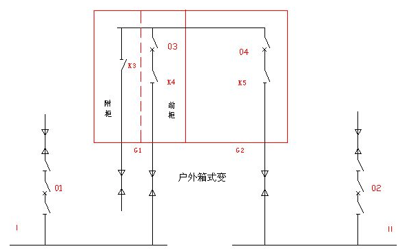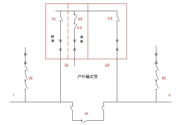 | 专业厂用电为一级负荷,一级负荷的供电电源应符合下列要求:一是一级负荷由两个电源供电,当一个电源发生故障时,另一个电源应不致受到损坏。一级负荷容量较大或有高压用电设备时,应采用两路独立高压电源。二是一级负荷中特别重要的负荷,除上述两个电源外,要必须增设备用电源。随着东风有限对供电可靠性的要求越来越高,电力处为了提高重要专业厂的供电可靠性,现对这些专业厂开闭所新架设第三回10kV独立电源进行供电(长期热备用)。现实如下供电方式:正常时两用一备,即当一路主电源事故停电时,投入备用电源;事故恢复后,备用电源切除,主电源投入。 专业厂开闭所供电方式采用单母线分段的形式,双独立电源系统供电,当一路电源事故停电或者检修时,合上母联,损失部分负荷,运行方式改为单母线运行,这对于重要专业厂来说是不允许的,甩负荷可能导致重大设备损坏和伤及人身安全以及打破生产的均衡性。因此应该尽最大努力减少单母线运行方式的出现。现在对重要专业厂新增一条独立10kV电源做为热备用,这样在任一路主电源事故或检修时投入,实现“N-1准则”,即任一电源故障都不会影像到专业厂的供电,不会损失负荷,可以尽量减少停电时间。时间就是金钱,这对专业厂来说是非常重要的。 实现“N-2准则(如果万一其它相关线路或设施由此发生异常,此时在设计上仍能保证系统安全和正常运行)”的要求,即考虑到两件关键元件同时停止运作(即"N-2")的规划准则。对专业厂KB所来说,就是任两回电源故障失电后,仍能保持电网稳定,但需损失部分负荷。 现有部分专业厂开闭所已经引入第三电源,但在如何引入以满足“N-1”或“N-2”准则时却遇到了困难。 1)第三电源不经过“相应装置”进行“分段”处理,难以同时为开闭所原有分段母线两侧同时提供备用。 2)专业厂开闭所内母线室现已经无法为第三电源提供“相应装置”的安装空间。 为解决上述问题,我提出以下三个方案,并作相应说明论述。 设计方案如下: 方案一 主接线图如下: 注:1 01、02、10单元为KB所原有双电源系统; 2 虚线框内为新增的户外箱式变(G1、G2共2面开关柜); 3 G1第三电源进线柜(前)和出线柜(附)(进入Ⅰ段母线),G2为出线柜(进入Ⅱ段母线) 保留原接线方式,增加一组箱式变:新增设备清单见附件1。 G1附柜和G2柜出线电缆分别与Ⅰ、Ⅱ段母线连接。主电源故障,手动投入备用电源;主电源来电,手动切除备用电源,恢复主电源供电。 其中,正常情况下户外箱式变所有断路器,隔离开关均在分位。 操作过程: 1 备用有电 1.1 01单元检修时,操作过程如下:合K1---合K3---合上03开关---拉开01开关---拉01线路侧隔离开关---拉01母线侧隔离开关,保证不间断供电和不损失负荷。检修结束后,恢复01供电,03备用,操作过程如下:合01母线侧隔离开关---合01线路侧隔离开关---合上01开关---拉开03开关---拉K3---拉K1, 02单元检修时同理; 1.2 01故障失电,01开关跳闸,操作过程如下:检查01开关在断开位置------拉01线路侧隔离开关---拉01母线侧隔离开关---合K1---合K3---合上03开关,其中Ⅰ段母线停电时间取决与上述操作过程的总消耗时间(从调度下令到操作结束)。事故处理结束后,恢复01供电,03备用,操作过程如下:合01母线侧隔离开关---合01线路侧隔离开关---合上01开关---拉开03开关---拉K3---拉K1,02故障失电同理; 1.3 01、02先后相继故障失电,01开关跳闸,操作过程如下:检查01开关在断开位置---拉01线路侧隔离开关---拉01母线侧隔离开关---合K1---合K3---合上03开关,同时02故障失电,02开关跳闸,此时操作如下:检查02开关在断开位置---拉02线路侧隔离开关---拉02母线侧隔离开关---合10靠Ⅰ段母线侧隔离开关---合10靠Ⅱ段母线侧隔离开关---合上10开关,损失部分负荷,01故障先处理结束,恢复分段运行和01供电,同时03投Ⅱ段母线,操作过程如下:合01母线侧隔离开关---合01线路侧隔离开关---合上01开关---拉开03开关---拉K3---拉K1---合K2---合K3---合上03开关---拉开10开关---拉10靠Ⅰ段母线侧隔离开关---拉10靠Ⅱ段母线侧隔离开关(若02故障先处理结束,恢复02供电,03投Ⅰ段母线,操作过程如下:合02母线侧隔离开关---合02线路侧隔离开关---合上02开关---拉开10开关---拉10靠Ⅰ段母线侧隔离开关---拉10靠Ⅱ段母线侧隔离开关),02(01)故障处理结束,恢复02(01)供电,03备用,操作过程见1.2。02故障失电后01故障失电同理;此项操作过程繁琐,耗时过多,处理过程中损失部分负荷,用户停电时间长。 2 备用失电 2.1备用失电后,操作过程同原先接线方式; 2.2备用恢复后,操作过程参加1。 闭锁关系: 1 01、02、10原五防闭锁不变; 2 G1柜实现五防闭锁,03与K2之间现实机械连锁,K1与K2之间现实机械互锁,即K1与K2禁止同时在合位,五防闭锁可采用JSXGN-12箱式柜机械闭锁,可将G1柜五防闭锁中的“上刀闸”机械闭锁延长至K2,闭锁与互锁见如下示意图: 注:1 K1、K2操作把手增开开1个圆孔 2 原G1五防闭锁的原上刀闸输出延长至K2操作把手; 3 03开关合上后,闭锁销向右运动,卡主K1操作把手,同时将“闭锁用”钢筋顶向右运动,卡主K2操作把手,03开关拉开后,恢复K2操作把手可分、合,从而实现闭锁;(注意调节上图所示的间隙); 4 当K1、K2都处于分时,K1、K2操作把手同时被卡住,当K1处于合位置时,互锁见上图所示,K2操作把手被卡住,当K1分,操作G3合时,互锁用钢筋向左运动,卡住K1,从而现实互锁。 方案二 主接线图
