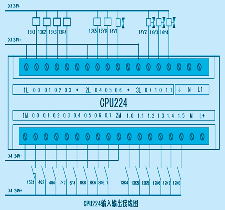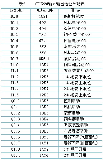 5 系统硬件设计 控制系统选用西门子S7-200系列PLC,选用了中央处理单元模块CPU224、数字量扩展模块EM223、模拟量输入模块EM231、模拟量输出模EM232、模拟量输入输出模块EM235。其中的中央处理单元模块CPU224外部接线图如图3所示、输入输出地址分配如表2所示。