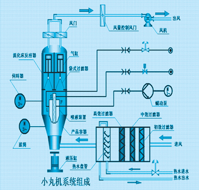 1 引言 由于实验室原有的控制系统使用的是十年前的人机界面和PLC,故其硬件均已老化,性能下降,在运行的过程中经常出现死机、黑屏、重启动,甚至某些画面参数不能修改;同时由于无相应的PLC编程器、编程软件和人机界面软件,因此可维修性也差。为了解决这些问题,我们采用西门子S7-200PLC和北京亚控公司的组态王6.05工控组态软件 的控制方案对小丸包衣制粒机的控制系统作了改进。 2 小丸包衣制粒机系统组成 小丸包衣制粒机系统组成如图1所示。小丸包衣制粒机是专门用于实验室或车间小批量生产的。药粉或类似的物料能在流化床中进行干燥、制粒以及包衣等过程。流化床物料容器底部装有筛网,药粉或小丸颗粒等类似的物料被盛放在筛网上。流动的空气经过滤处理后经容器底部的筛网向上流过,当流速达到一定速度时,颗粒(药粉)就会被空气托起,床内粒子就开始流化起来,形成流化床。流化床内的颗粒(药粉)在容器中剧烈搅动,并延伸到容器的扩展区,细微的粉末或轻微的颗粒则被粘附在袋式过滤器上。为了防止袋式过滤器的堵塞,控制滤袋升降的气缸会有一个间歇的抖动操控。空气经过袋式过滤器、控制风量大小的风门和风道被风机引出室外的大气中。在这个过程中,流化床容器内的微粒能完全充分的与空气流接触,并且搅动剧烈,因而能够很好的完成充分干燥,良好制粒,精致包衣等制药过程。