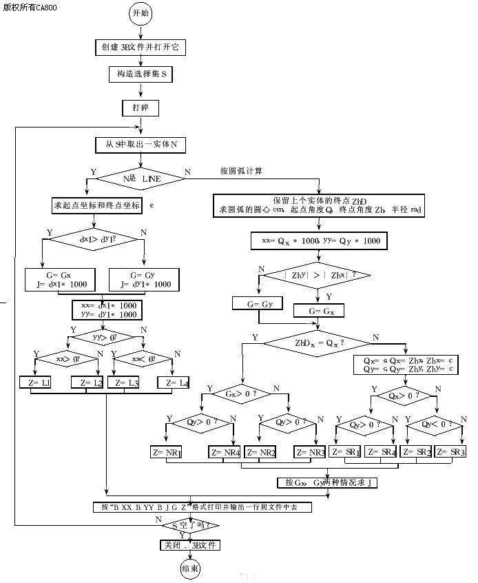 2 程序设计的方法 程序首先调用gettfiled()函数创建一个NC文件(该文件以.3B为扩展名),然后用ssget()函数定义实体选择集(由用户依加工顺序选取),经解碎后成为“Line”和“Arc”两种类型(经研究发现,对v12.0,图形实体解碎到最后均为Line和Arc,如Fit拟合的pline解碎后为Arc,spline拟合的pline解碎后为line等等),因此程序的核心以line和Arc为对象。程序调入下一个实体,判断其是line还是Arc,分流后按line或Arc的组码提取几何数据进行计算,最后形成一字符串“B XX B YY B J G Z”,将这行字符添加到NC文件中去,然后再调入一个实体进行循环计算,这样NC文件就一行一行地增加,直到实体被编辑完毕。