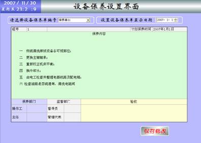 实际应用中,以上提示方式经常根据实际情况混合使用。 不论是何种功能的报警提示,还是以何种方式提示,通常情况下,其具体实现往往是将预先设定好的保养内容保存在关系数据库,然后周期检测保养提示的条件,比如时间、设备实时数据等参数,一旦满足条件,就以设定好的方式提示设备保养。 设备保养功能通常被嵌入到设备监控系统当中。借助紫金桥组态软件自身丰富的设备驱动可以方便的联接现场设备,实时分析各种相关数据,同时通过紫金桥组态软件提供的自由报表等组件可以轻松访问各种关系数据库,进行插入、查询、更新、删除等操作。下面列举一个笔者使用紫金桥监控组态软件在一个车间监控系统中实现的设备保养功能的例子。 该工厂共有122台设备,需要每隔一段时间进行设备保养,保养单可以由系统管理员进行设置,包括保养日期、保养内容等,保养单由相关负责人进行确认。不同人员拥有各自的权限以及密码,保养提示主要是以表单提示和声音提示为主。图1是设备保养设置的界面: