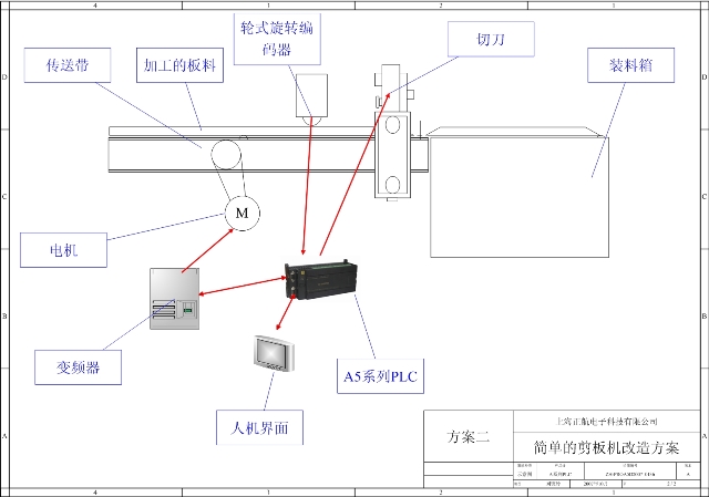 在方案一中,加工料的长度是通过光电传感器的位置来控制的。人工手工设定光电传感器的位置会有一定误差,同时如果需要加工的长度频繁改变时会很麻烦。 改造方案二取消了光电传感器,取而代之的是一个轮式旋转编码器。将轮式旋转编码器压紧在板材的表面,当板材向刀口输送时,轮式旋转编码器跟随旋转,输出的脉冲信号输送到A5的高速计数器。A5的高速计数频率可达20KHz,可以很精确地根据脉冲数量精确地测量出送料长度。 旋转编码器安装在刀口前面,只要旋转编码器其距离刀口的位置固定,就可以方便地对加工材料进行长度测量。 在方案二中,可以通过人机界面非常方便地设置加工长度,甚至可以设定多组加工长度和加工数量,或者尺寸也可以置为循环变动值。例如,可以设定加工100块80cm的板材,再加工200块100cm的板材;也可以设定成循环加工1块80cm的板材、1块90cm的板材。