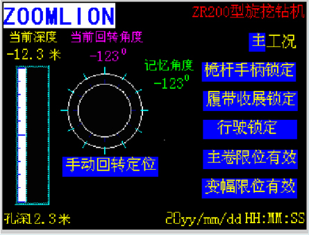 %var%作为%var%对话设备,主要进行钻进深度、回转角度的显示、深度设置、时间校对、及实现有关功能切换、按钮、指示、系统调试等功能。共设有:主作业画面、参数设置画面、报警记录画面、系统调试画面。其中主作业画面是操作人员工作时的主要对话界面。下图为主作业画面图: