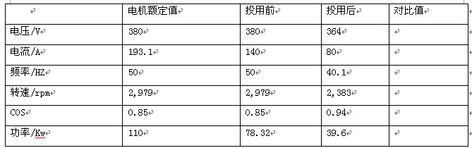 javascript:if(this.width>580)this.width=580"> 从表中可以看出,使用变频器后功率节省38.72kw,按年运行8000小时计算,每年可节省电能309760kwh,若按电价0.35元/kwh计算,每年节约电费10.8416万元。不到一年可收回投资。 三、结束语 实际应用证明,变频器的使用可取得意想不到的效果,特别是企业正在为降低生产成本提高经济效益而大量采用新技术的今天,变频调速技术以其良好的投入产出比,将会有更加广阔的应用前景。深圳艾默生电气的变频器是在消化各种变频器的基础上,根据我国电网波动范围较大的状况开发的,其功能齐全,性能稳定,到目前为止在我厂使用了12台艾默生TD2000系列变频器,功率在90KW-250KW,运行一年多从未出现质量问题。 |
