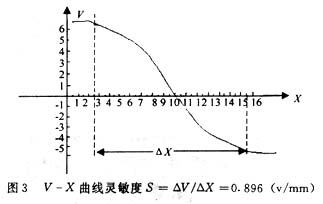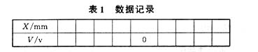 装上测微仪,带动振动台位移,使电容动片位于两静片中,此时差动放大器输出应为0。以此为起点,向上和向下移动动片,每次0.5 mm,直至动片与一组静片全部重合为止。记录数据,并做出V-X曲线,求得灵敏度S=ΔV/ΔX。