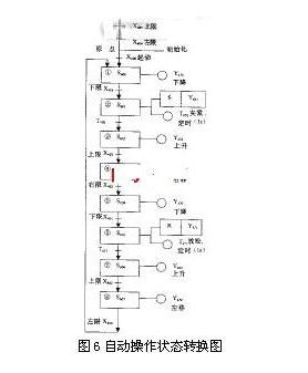 机械手自动操作流程图如图5所示。状态转换图如图6所示。梯形图如图7所示。 |