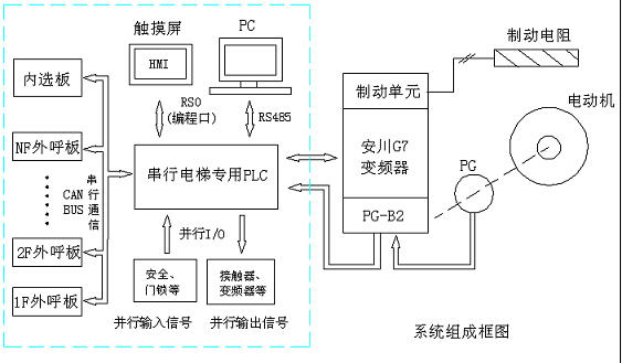 系统由串行电梯专用PLC、输入输出接口和拖动部分(包括变频器、旋转编码器、PG速度卡、制动单元、制动电阻、电动机等)组成。 如图1所示: