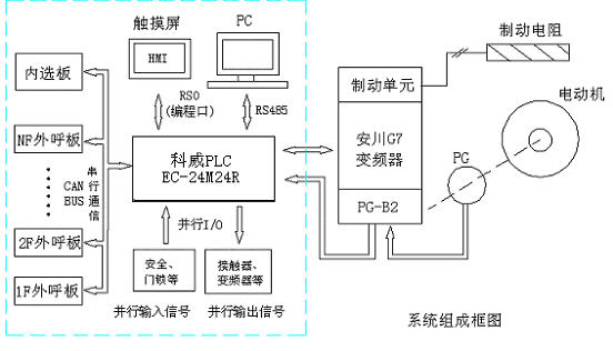 系统由EP系列PLC、输入输出接口和拖动部分(包括变频器、旋转编码器、PG速度卡、制动单元、制动电阻、电动机等)组成。 如图3所示: