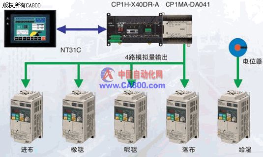 利用机械作用使织物的纬密和经向织缩增加到一定程度而具有松弛的结构,再通过机械预缩手段,使织物中原有的潜在收缩在成为成品之前预先缩回而收到明显降低成品缩水率的效果,这就是预缩机的作用。 ![]() 预缩机的工作过程是使加工织物经居中装置,超喂辊自由落入网式输送带,经输送带输送织物经汽蒸(给湿)、松弛、烘干、冷却,达到一定的预缩。进布由光电检测,并控制织物自动处于居中位置。 欧姆龙整体解决方案及其优势: 在预缩机控制系统里,我们采用了欧姆龙彩色触摸屏NT31C、高性能小型PLC CP1H带一块4路模拟量输出模块和3G3JV、3G3RV系列变频器。预缩机的进布、橡毯、呢毯和落布都由模拟量方式进行闭环控制,给湿部分用CP1H主机上的电位器独立控制。人机界面NT31C上显示预缩率、车速、同步、温度、压力等重要工艺参数。 ![]() PLC:CP1H 快速的处理器,执行基本指令只需0.1μs,特殊指令0.3μs以上 最大支持320点开关量 XA型内藏4入2出模拟量功能,分辩率1/12000 标准搭载4轴高速计数器功能(单相100kHz/相位50kHz)和4轴100kHz高速脉冲输出 标准搭载USB并联端口 串行通讯端口可自由选择RS-232C、RS-485(2端口) 支持HostLink、NT LINK、Compobus/S、DeviceNet、Profibus-DP、ControllerLink、EtherNet、协议宏、Modbus-RTU等多种通讯方式及串行PLC连接功能(最多9台) 支持CPM和CJ1系列PLC的扩展单元 丰富的指令用语,包括PID、浮点运算、三角函数等… HMI:NT31C 采用32位RISC芯片,更加快速 用内存单元能实现在现场方便地传送画面 可更换背灯,实现了长寿命化 确保与IP65F相当的优秀耐环境性 用多色显示图形,能更方便地观察几个数据 弹出窗口功能,有效利用画面 报警功能,即时掌握错误内容,改善机器运行状况 内存表数目是以前的2倍 Inverter:3G3*V 功率范围从0.1kW~300 kW 具有大额定电流、刹车短路器(15kW以上)、大额定电压、高起始转矩、短路及漏电检测、掉电故障释放等高性能 以应用为导向,完善的PID控制、能量补偿算法、矢量控制、低噪音、有效的刹车手段、以及多功能的输入输出 内建一系列接口,使通讯和使用更方便 使用Windows界面的参数设定软件 |