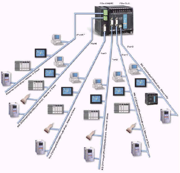 Bs-PLC之5个通讯端口可同时连结各种智能型外围,界面则有USB、RS232、RS485、以太网络(Ethernet)可供选择,除可选用永宏标准通讯协议或Modbus通讯协议或透过FATEK Communication Server通讯伺服器来通讯外,尚可利用CLINK通讯便利指令,自行定义通讯协议主动或被动地与任何智能型外围联机。