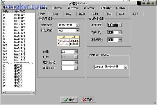 (1) 主机具备4个200kHz的硬件高速计数器(HHSC)和4个频率总和为5kHz的软件高速计数器(SHSC),无需另加高速计数模块即可满足系统需求。软件高速计数器支持U/D,P/R,A/B三种计数模式,硬件高速计数器更是支持U/D*2, P/R*2, A/B*2,A/B*3, A/B*4,共计8种计数模式。