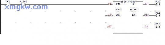 (3) 通过通讯口port1~port4的任意一个,都可以使永宏PLC作为主站,与外围设备通过Modbus协议进行通讯。同样是通过“功能指令+表格”的形式,FUN150.M_BUS指令可轻易实现PLC对变频器的通讯控制,简单显示如下:
