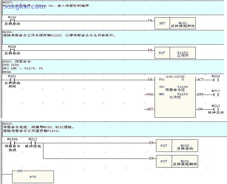 z开机脉冲M1924 ON,执行 FUN141.MPARA设定伺服参数。z按X8,令M100 ON,调用子程序 STEP+,令伺服马达正转 DR1070的脉冲数。