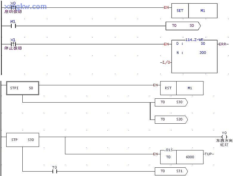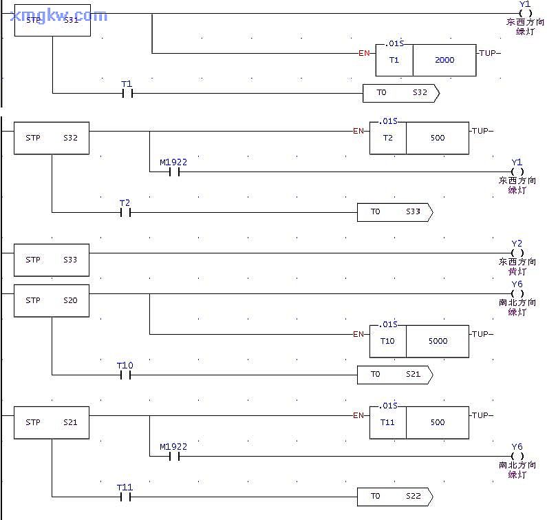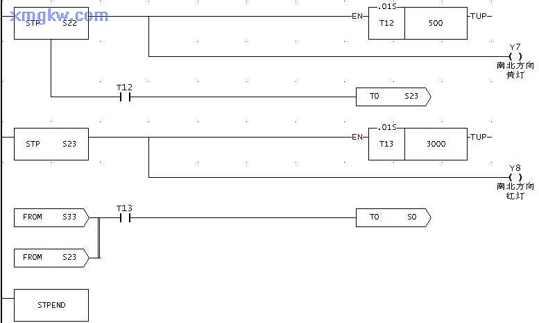 东西方向的黄灯亮时间( Y2)并没有用定时器来控制,这是因为当南北方向红灯亮时间结束后(同时也是东西方向黄灯结束时间), T13=On,在 S33 和 S23 都为 On 的状态下,返回到步进点 S0,S33 和 S23 步进点对应的 Y状态被复位, Y2自然也被复位。