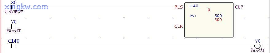 - C140计数达到 500次时, Y0=ON,生产指示灯亮,同时对产品生产计数重新复位。