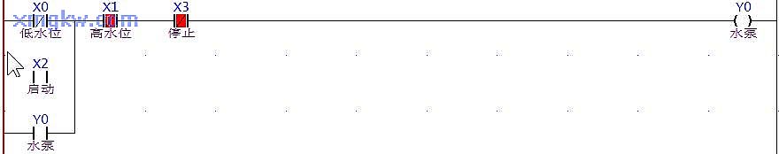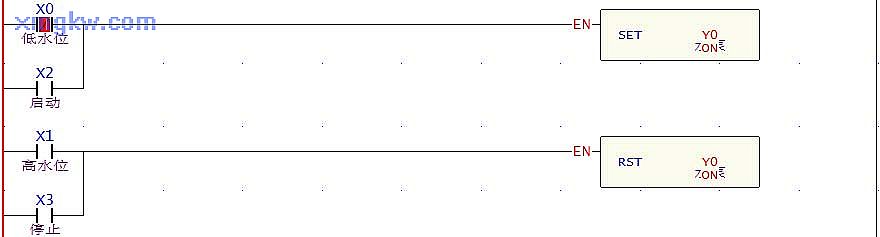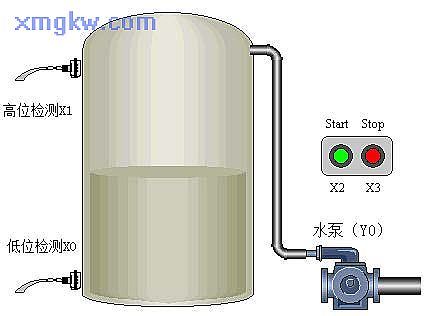 【控制要求】水塔储水控制:当按下 START按钮 X2或塔内储水量低于低水位检测光电 X0时,水泵( Y0)开始运行,抽水至水塔内;当按下 STOP按钮 X3或塔内储水量高于高水位检测光电 X1时,水泵停止抽水工作。